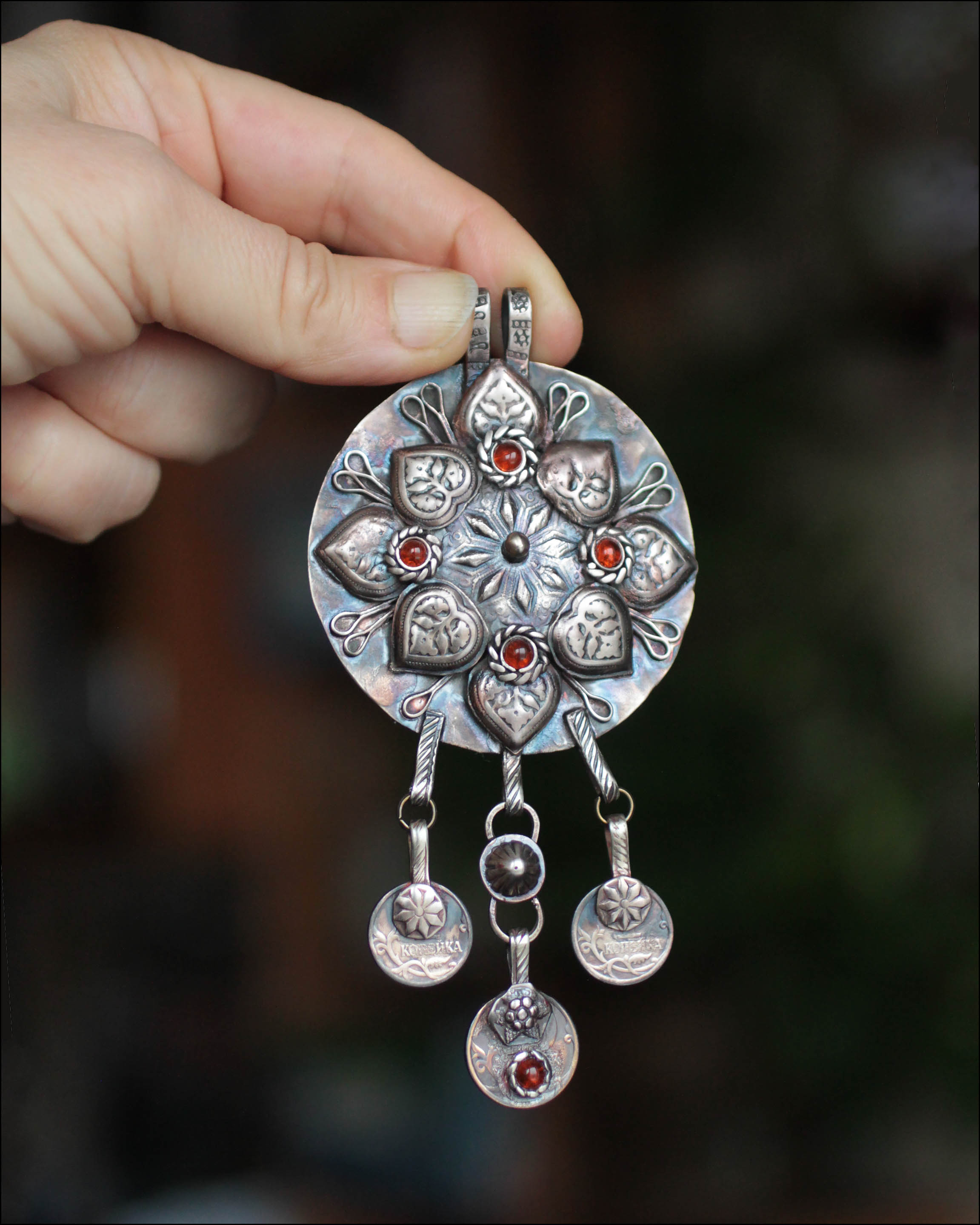 Материалы: мельхиор, монеты, плавленый стеклянный бисер.
