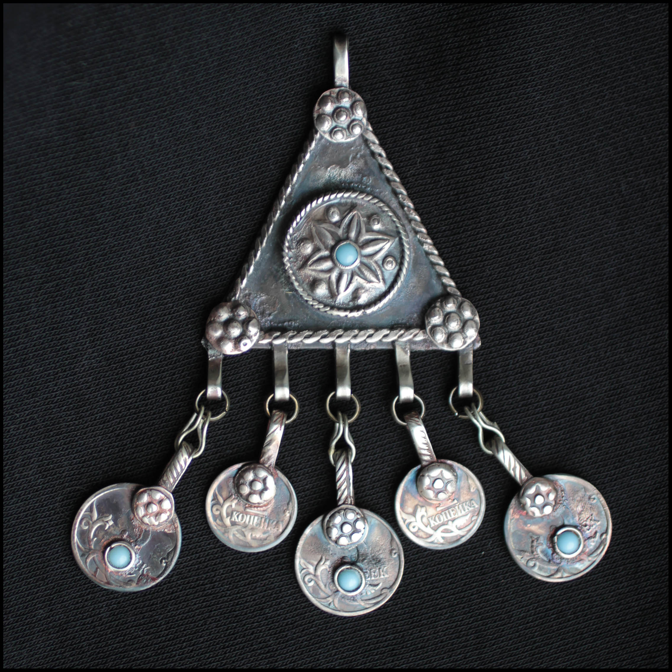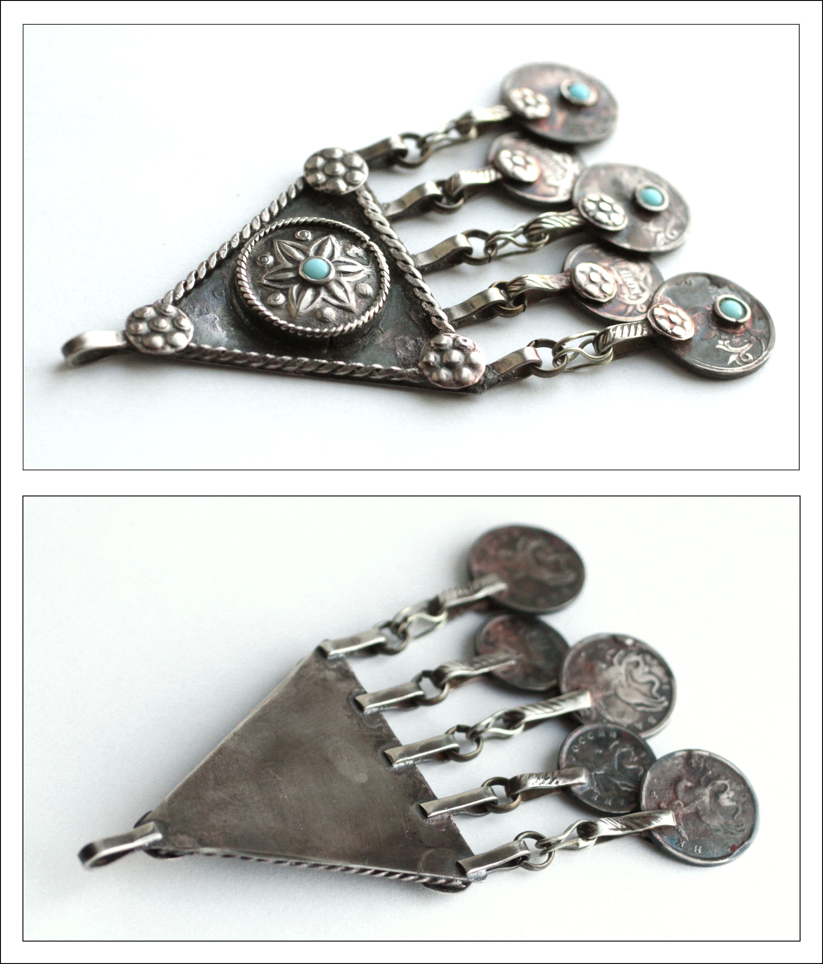 Материалы: мельхиор, российские монеты (1 и 5 копеек). Вставки - плавленый стеклянный бисер.
