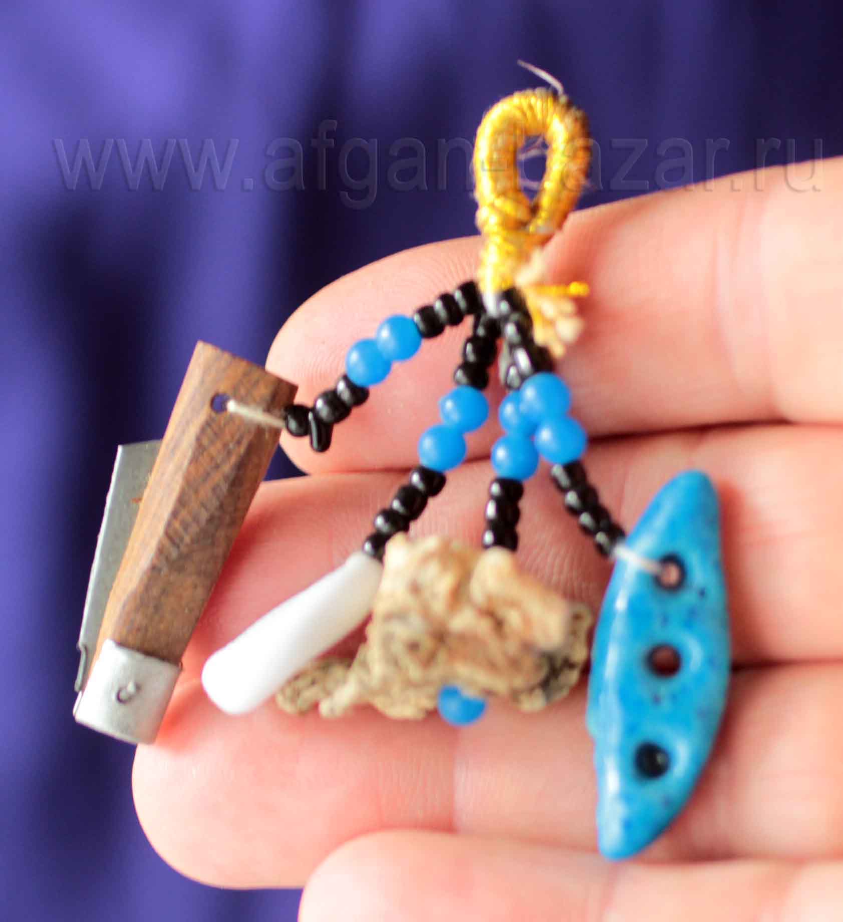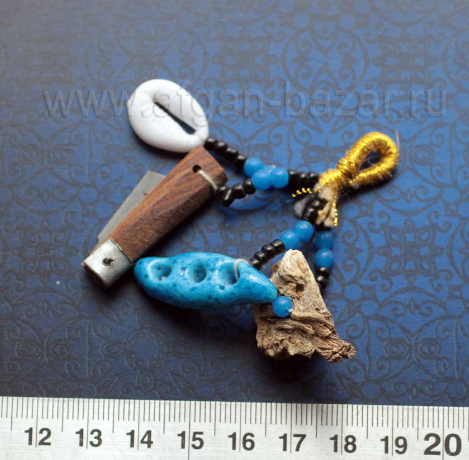 Керамическая бусина с голубой глазурью и отверстиями, кусок кости, имитация бусины каури из пластика, макет складного ножика.