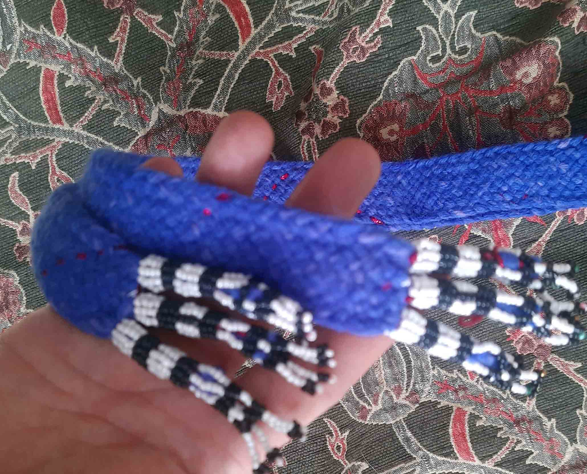 Бисерные кисти являются своеобразным противовесом, помогающим продеть пояс в шальвары, для чего обычно используется специальный инструмент.