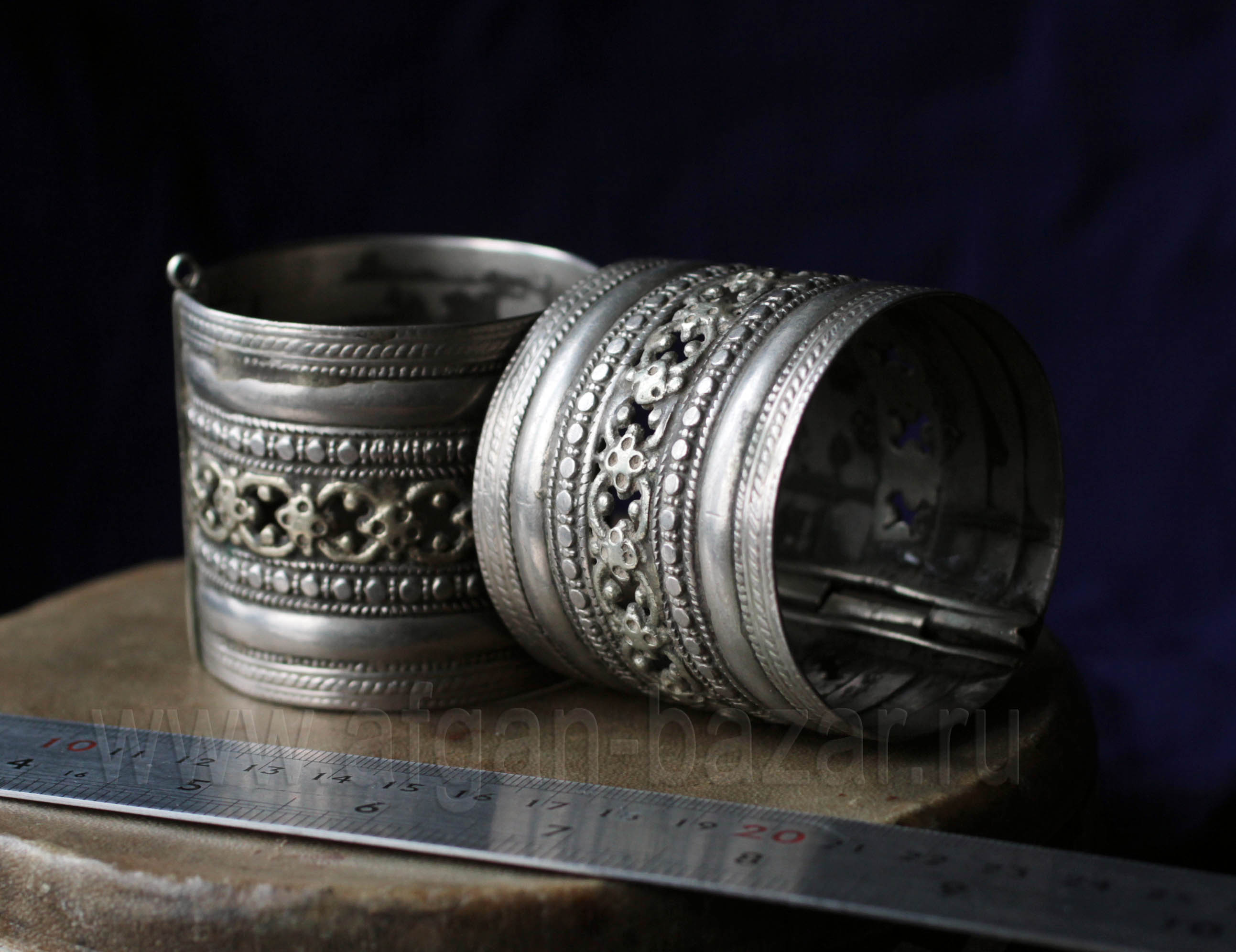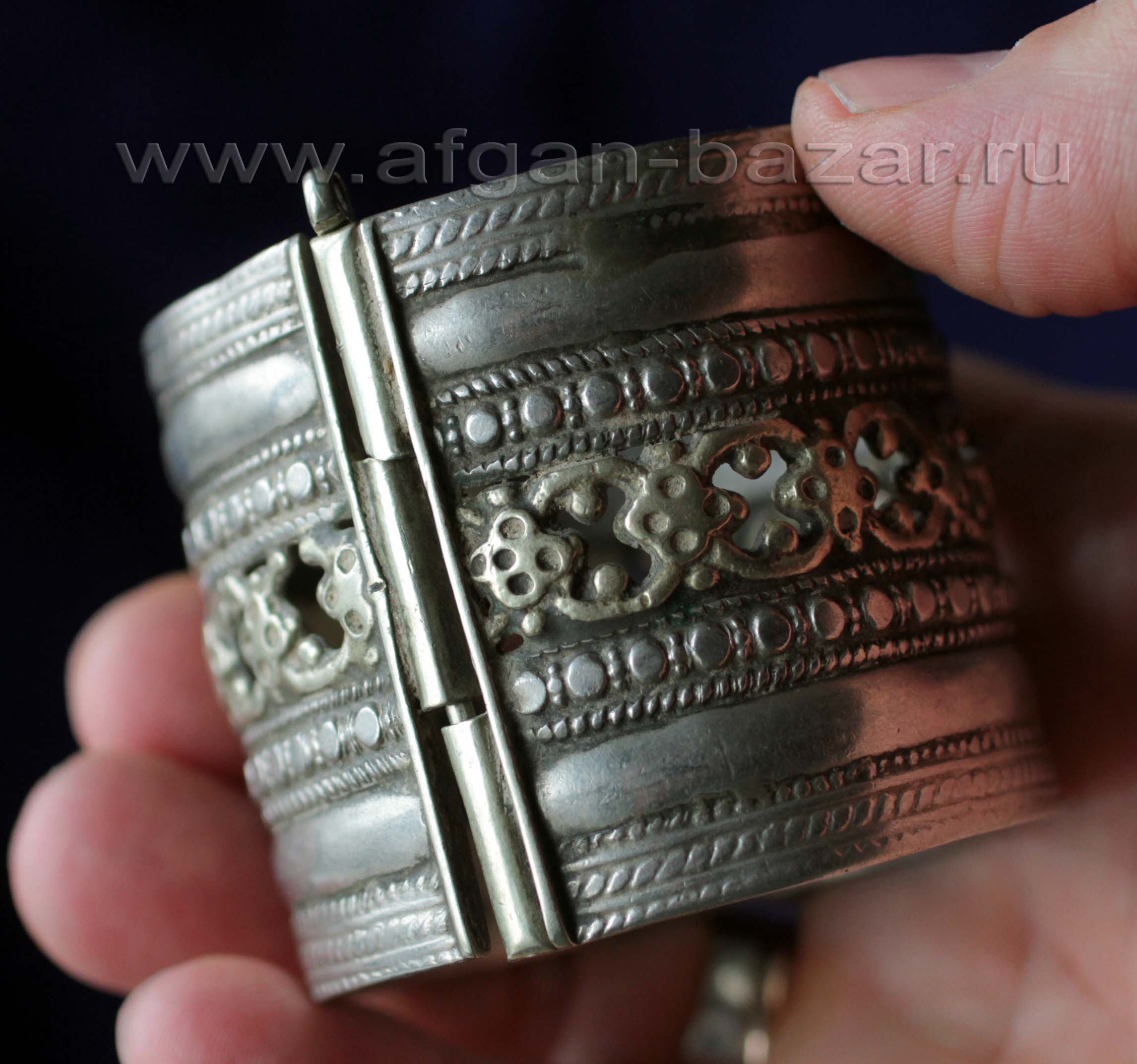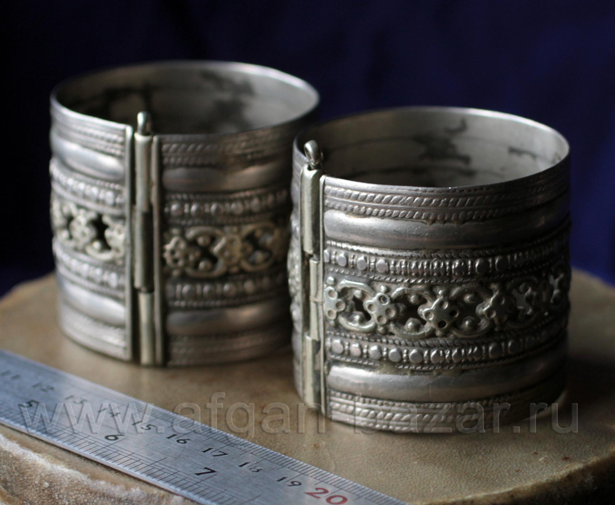 One of the most popular forms of Afghan tribal jewelry. Such bracelets are called "Bahu" (push.) or "choori" (Farsi), sometimes reach impressive sizes, tightly fit the wrist and connect the pin.