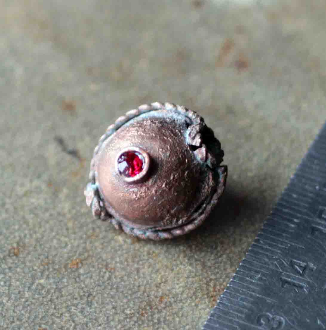 Медь, горячая эмаль, кусочки меди, вплавленные между слоями эмали.