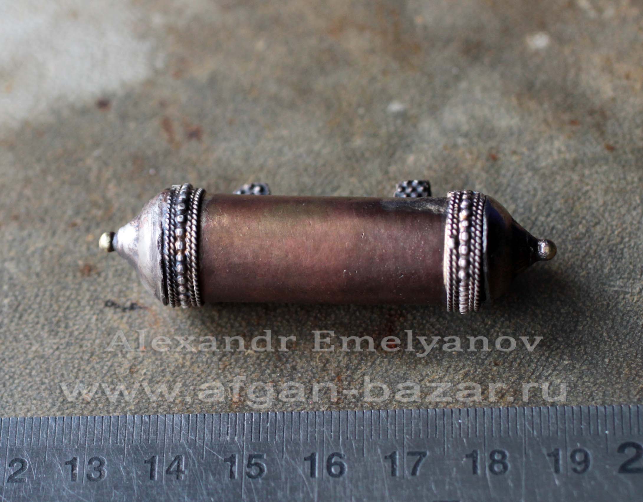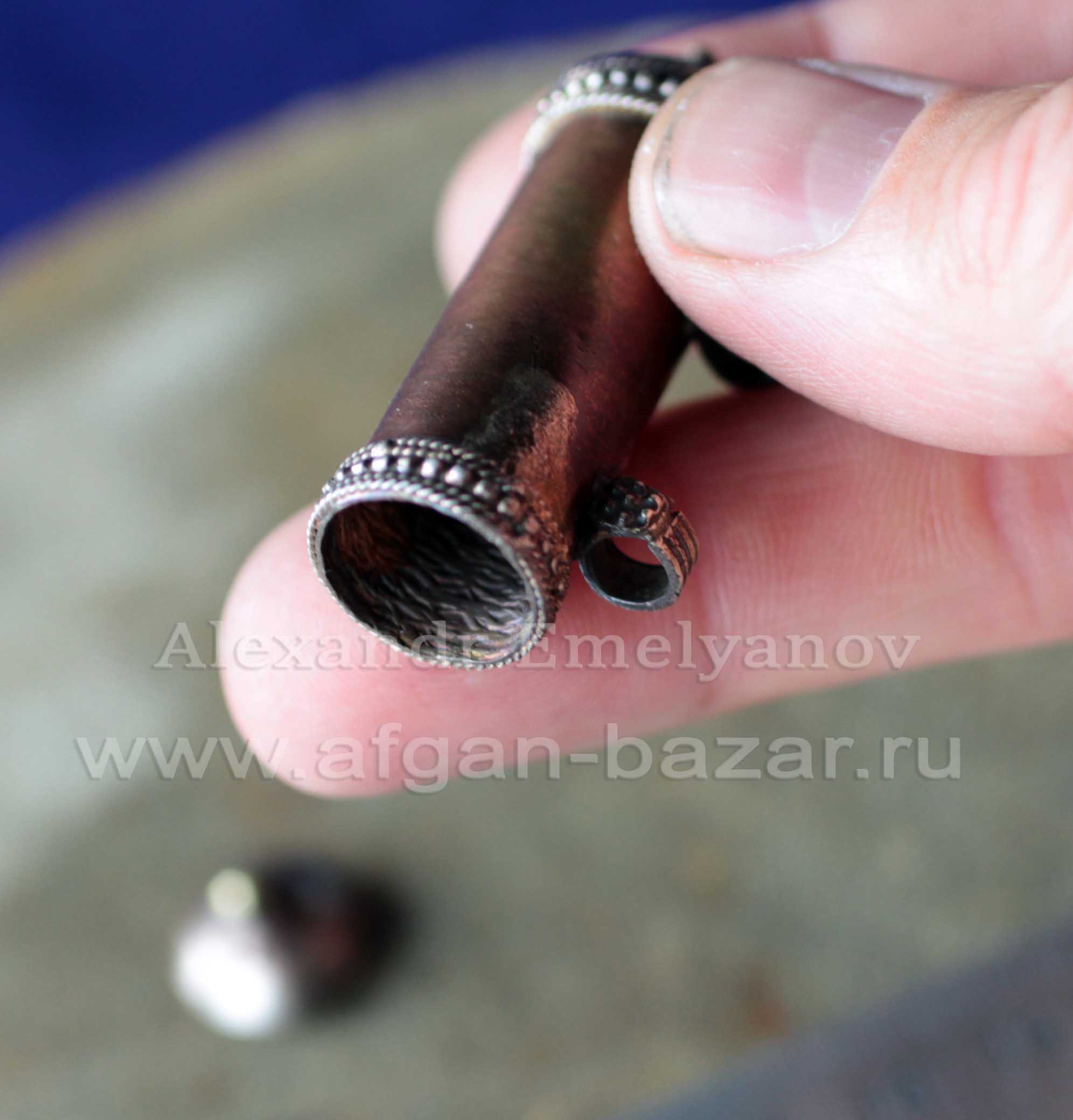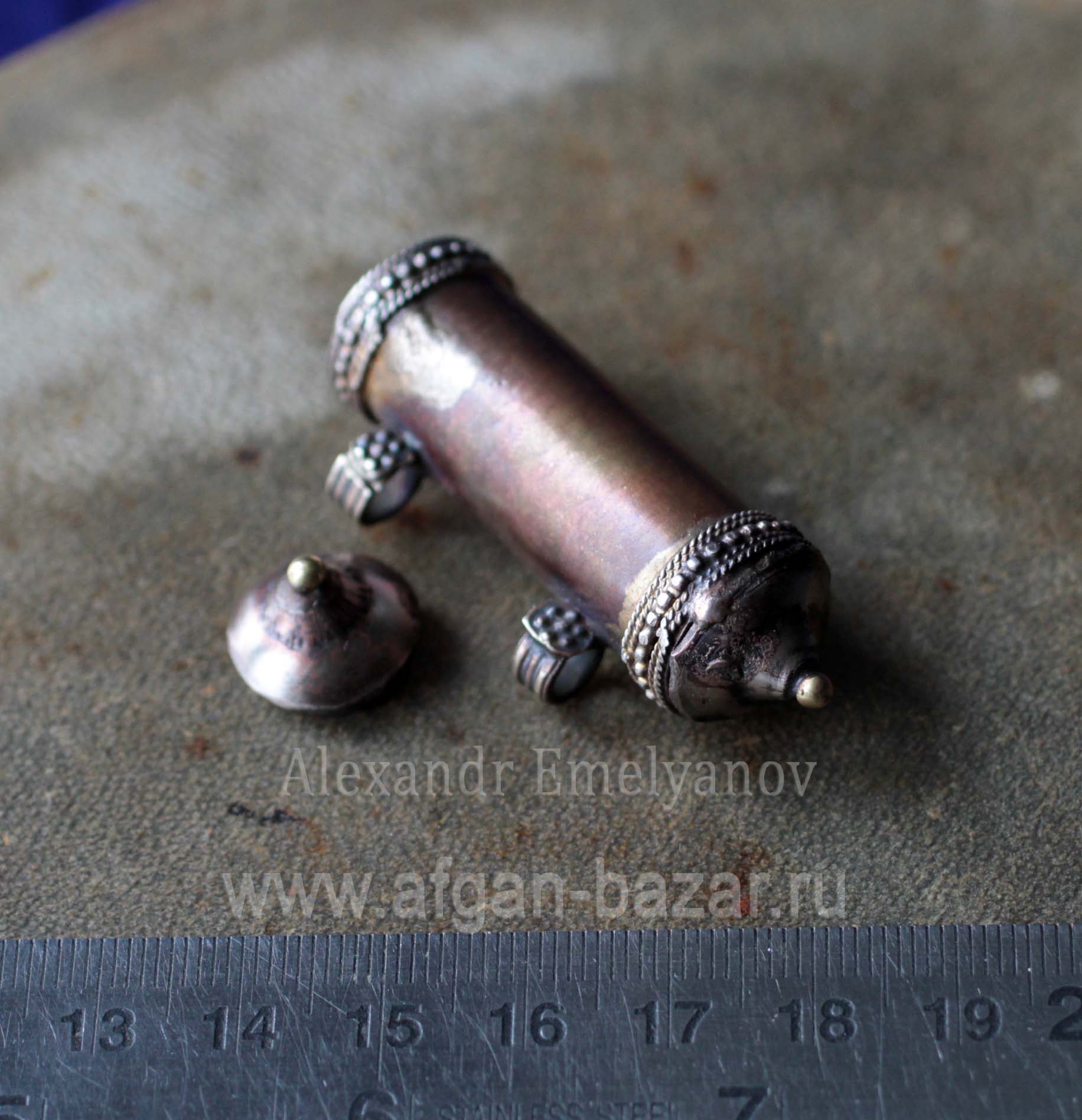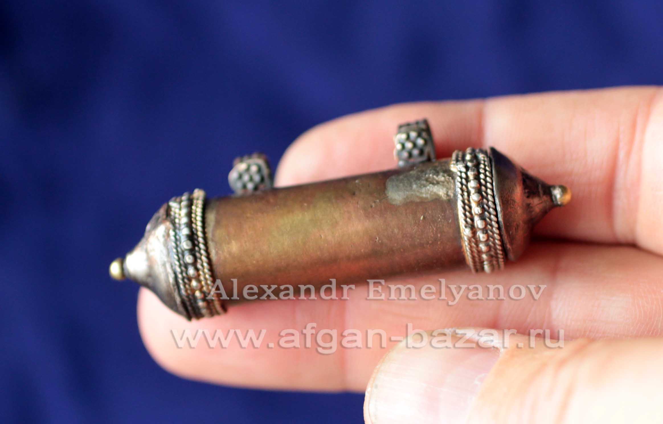 Артикул: 10020Афганский амулет "Тавиз". Авторская реставрация, автор - Александр Емельянов. Восстановлены петли и боковые крышечки, открывается сбоку. Основа - Афганистан или северный Пакистан, 20 в. Металл, медный сплав. Прокатка, выколотка, штамп, зернь. Длина - 60/70 мм. Диаметр - 13 мм. Вес - 11 г. Тавиз (амулетница). От арабского ta`widh (تعويز) (очарование, амулет). Горизонтально или вертикально ориентированная пустотелая подвеска для вложения охранительных текстов со съемной крышечкой на конце. Термин используется также для обозначения подвесок аналогичной формы из металла или камня. Литература и аналоги: 1. Alfred Janata. Schmuck in Afganistan. / Janata A. - Graz: Akademische Druck – u. Verlagsanstalt, 1981. - s.53 2. Wolf-Dieter Seiwert. Jewellery from the Orient. Treasures from the Bir Collection. – Stuttgart: Arnoldshe 2009 – p. 194