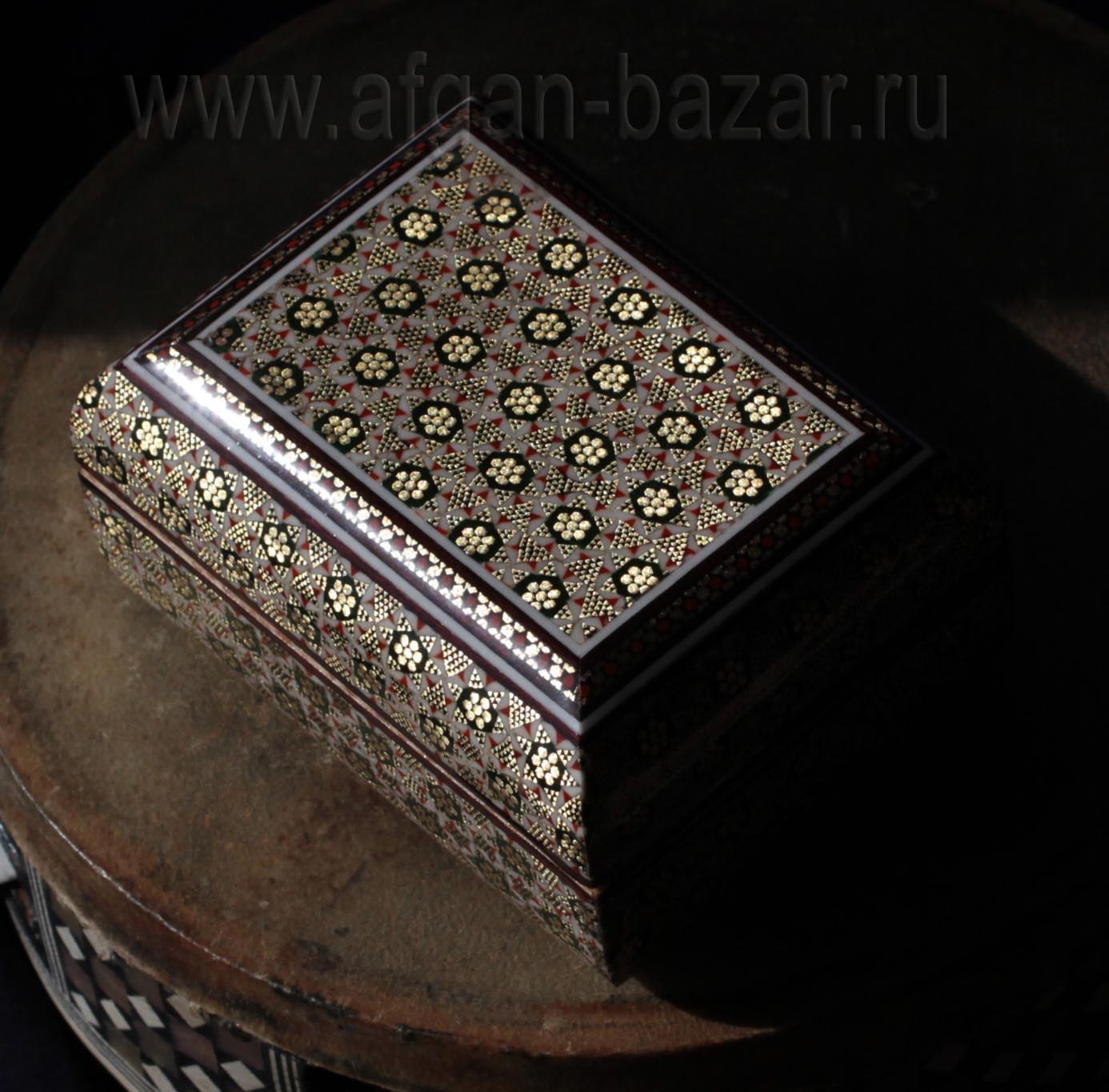 Украшения, этнические/винтажные, медь/латунь/бронза, Афганистан и Средняя Азия, косметические принадлежности, Иран, Африканские и арабские украшения, Иран, Аксессуары, посуда, шкатулки и коробочкиДеревянная шкатулка с инкрустацией "Хатам". Иран, Исфахан, современная работа