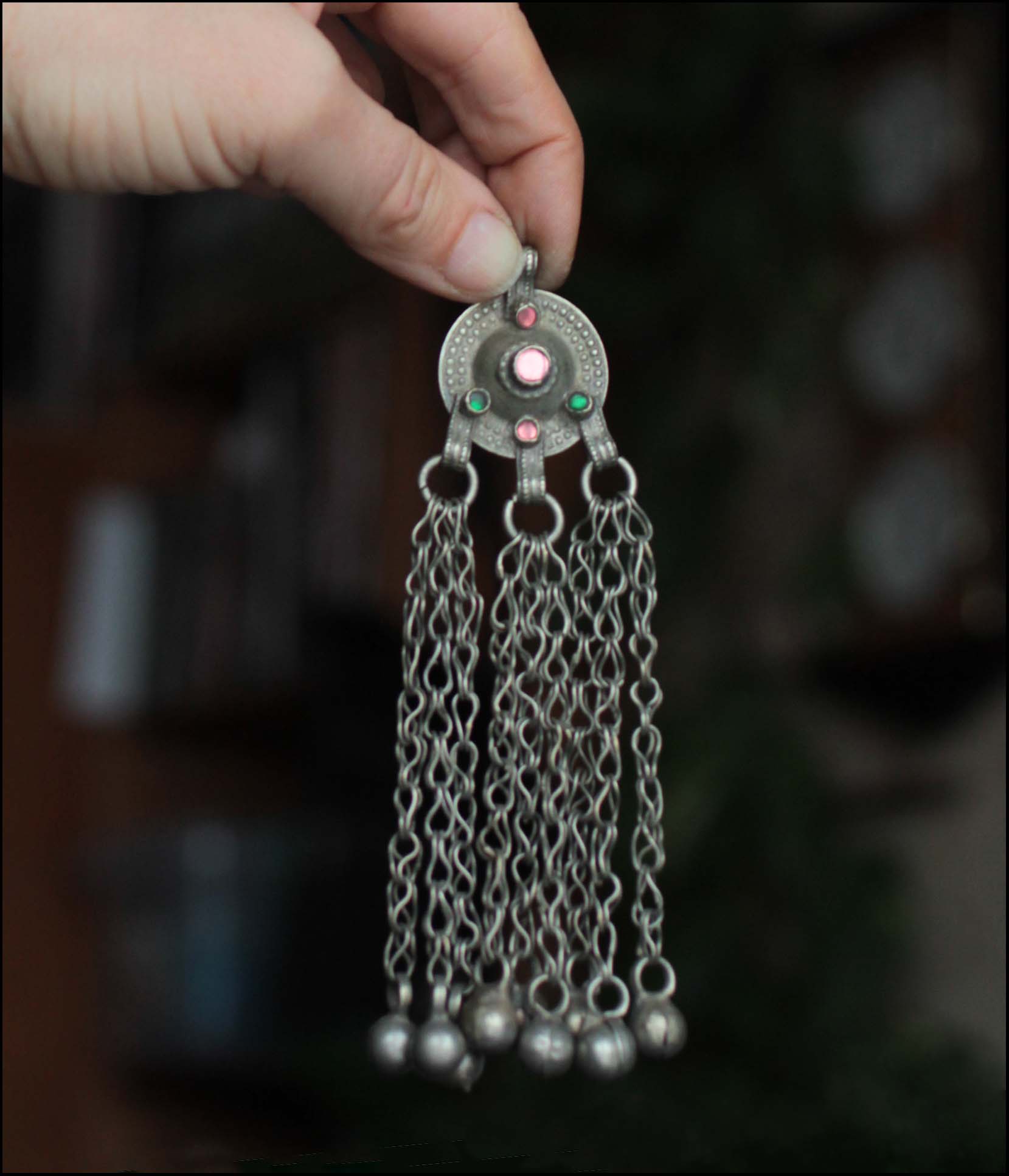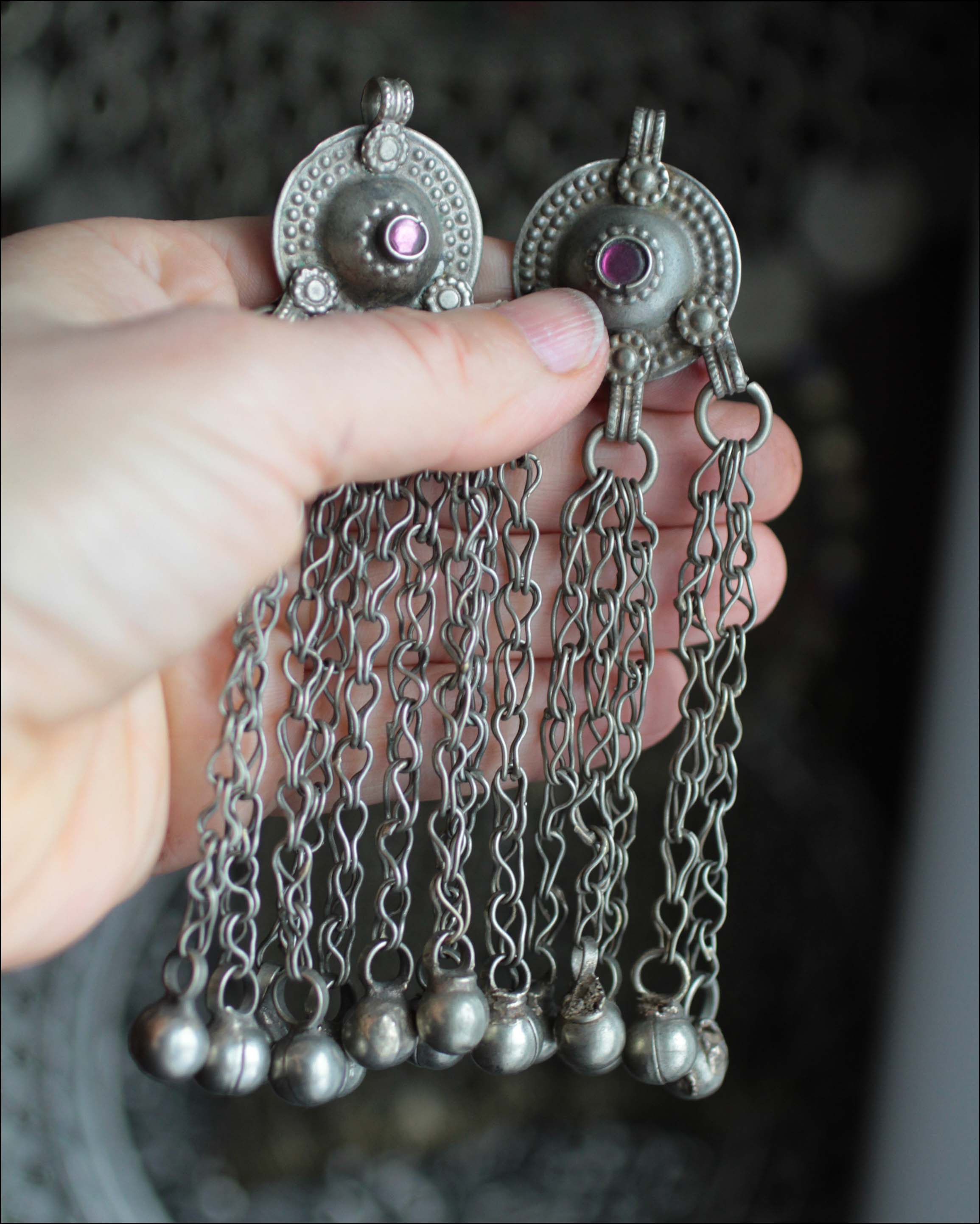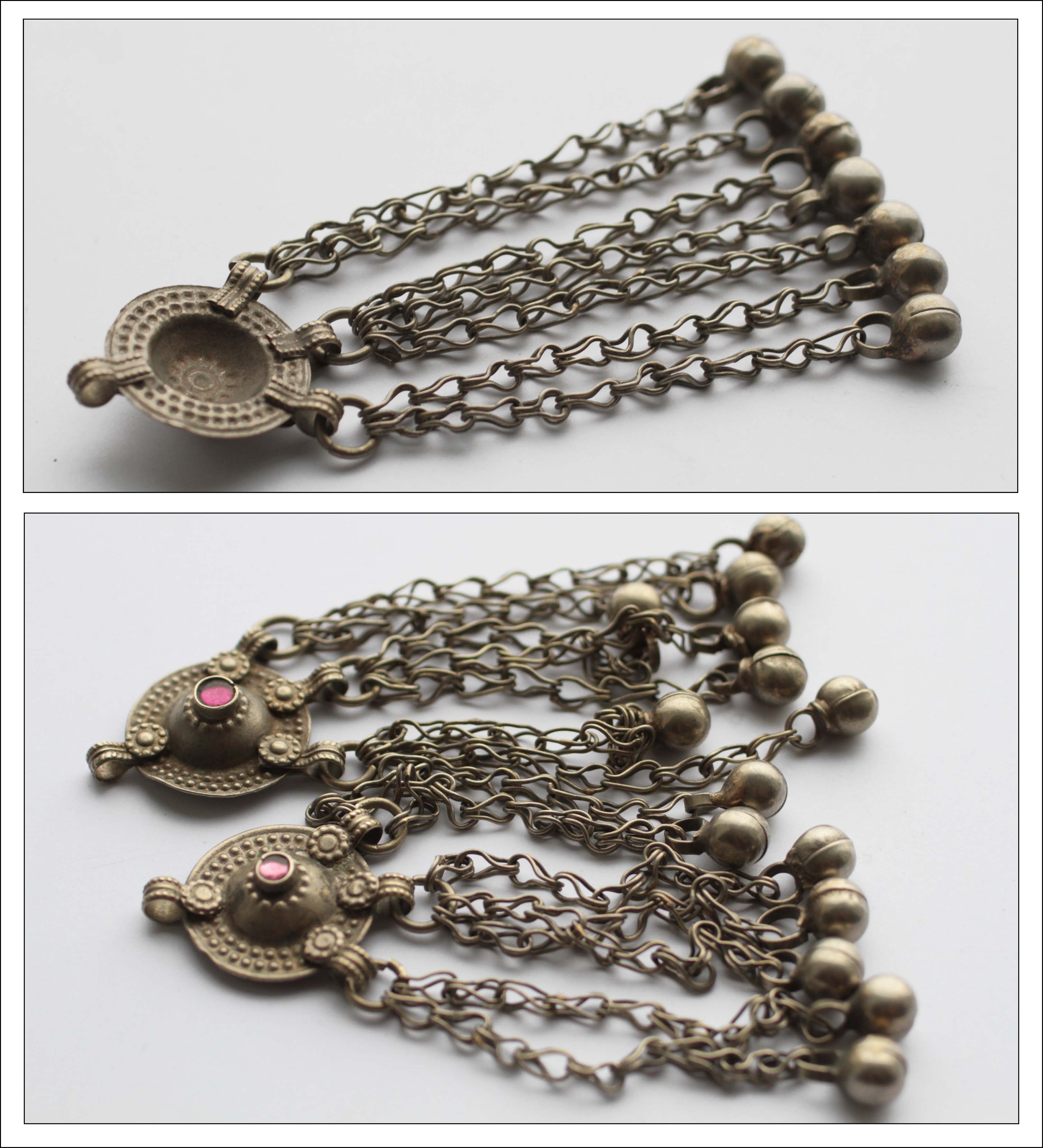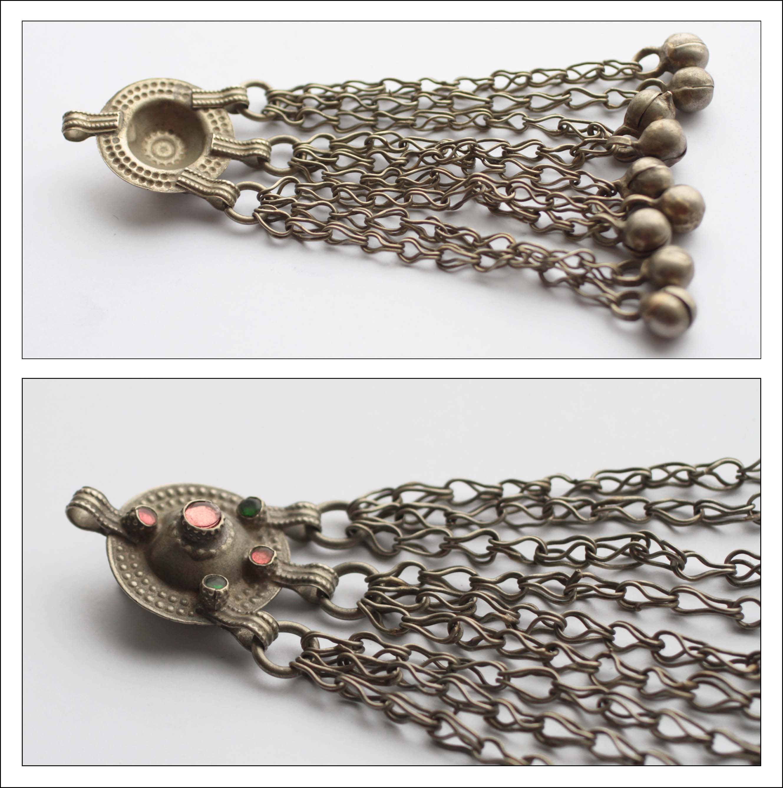 Афганистан/Пакистан/Средняя Азия, металл, Фурнитура, кнопки с подвесами и мелкие подвесы, кучи фурнитура, кнопки с подвесами, Этническая фурнитура для расшивки костюмовКрупная кучи кнопка с подвесами на цепях 1 шт. (Tribal Kuchi Jewelry)