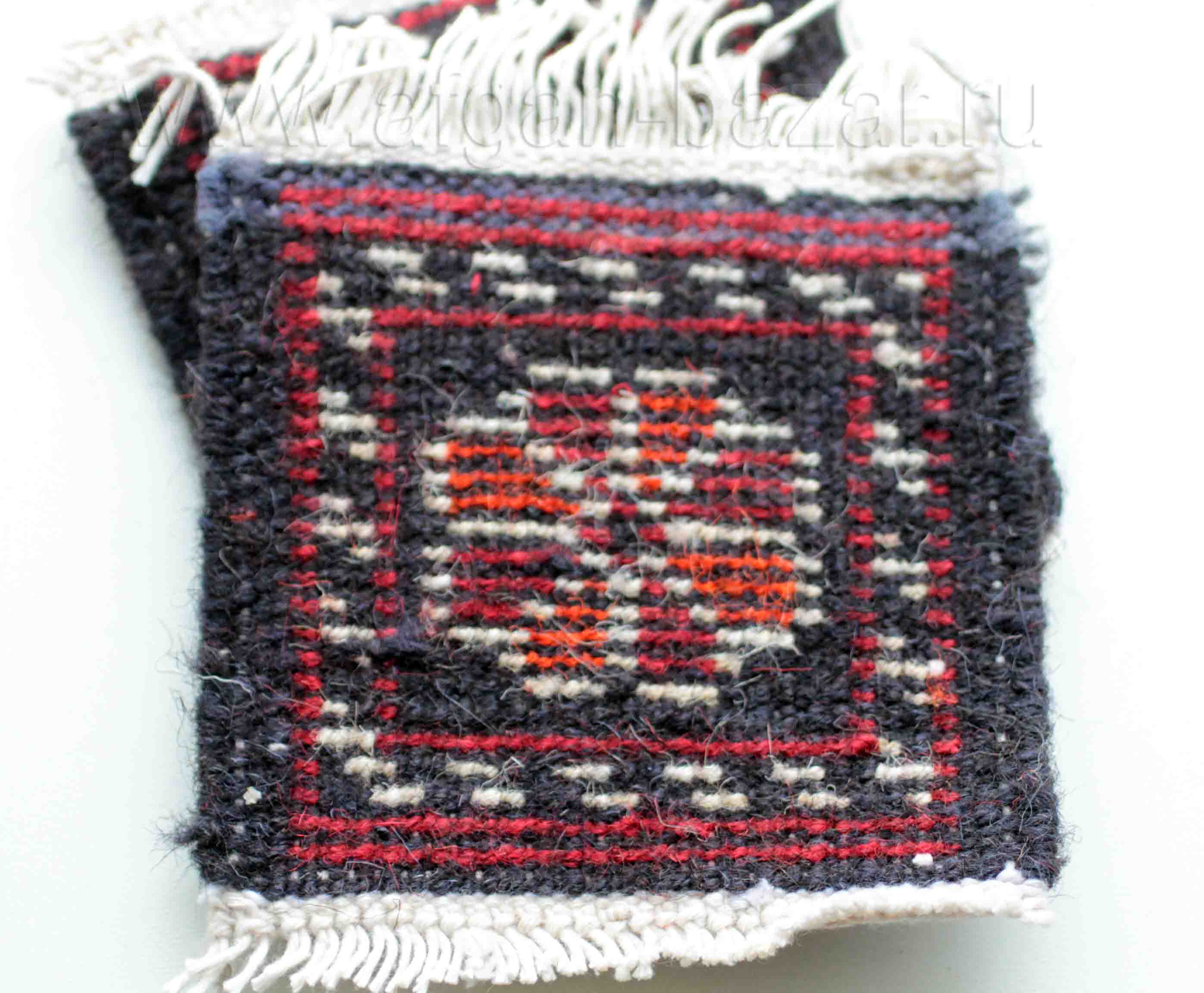 Артикул: 8257Винтажный персидский коврик с изображением птицы и тюльпана. Иранские туркмены, 20 в. Шерсть, ручное ткачество. Размер без учета бахромы - 26/27 см.