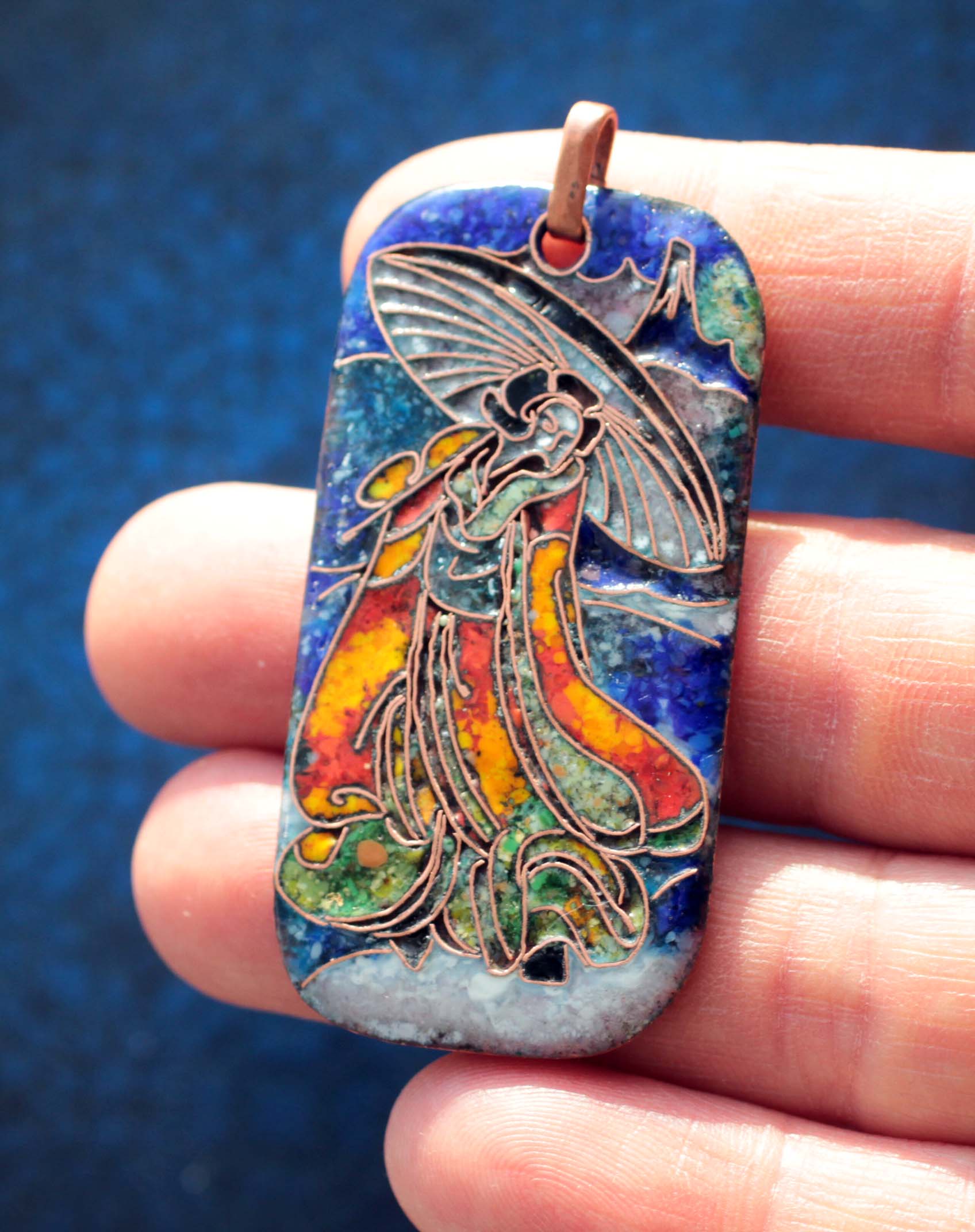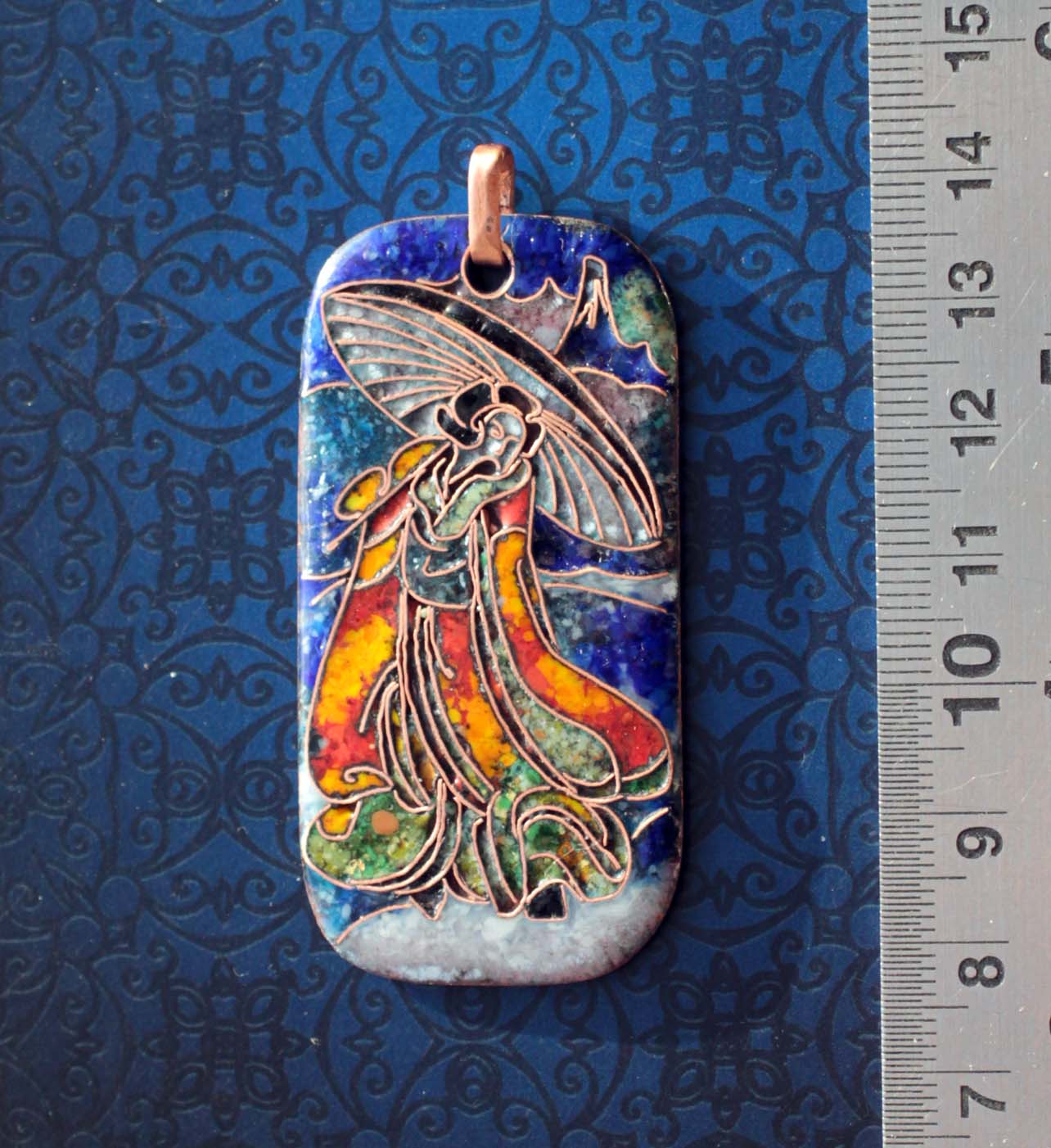 Артикул: 6163Кулон в китайском стиле с изображением по мотивам японской миниатюры (гейша). Автор - Solus Rex Медь, горячая перегородчатая эмаль.