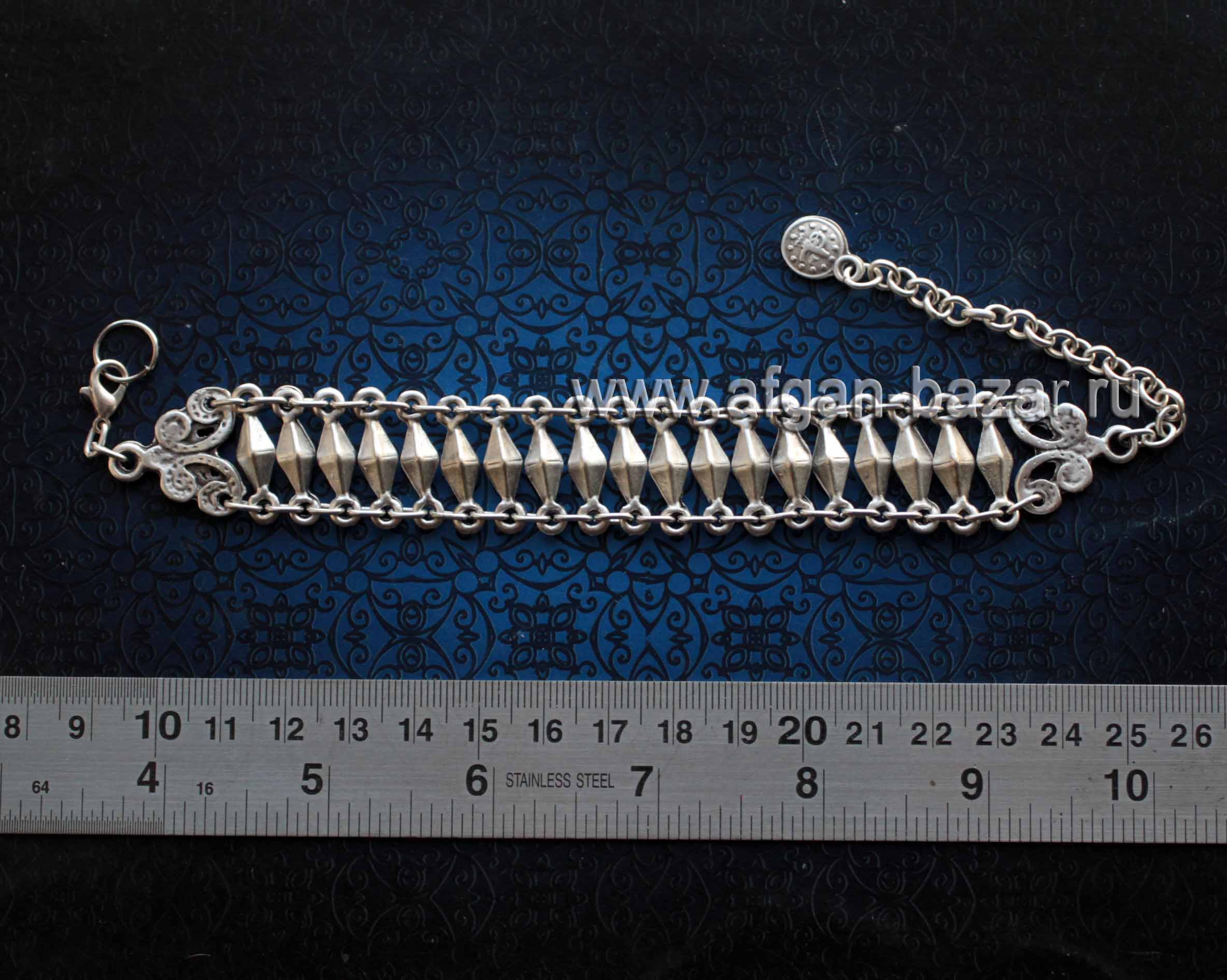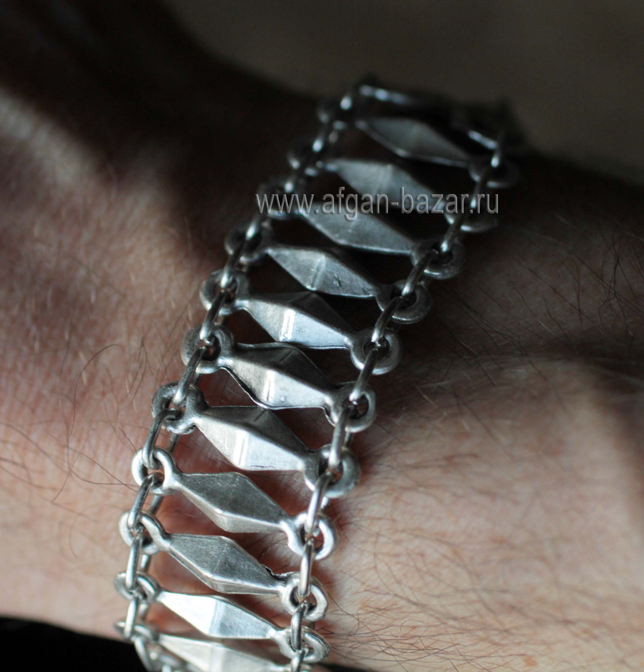 Артикул: 4391Браслет в восточном стиле Производство - Турция Сплав на основе алюминия с посеребрением Ширина - 35 мм, длина без цепочки и замка - 140 мм Вес - 28 г.