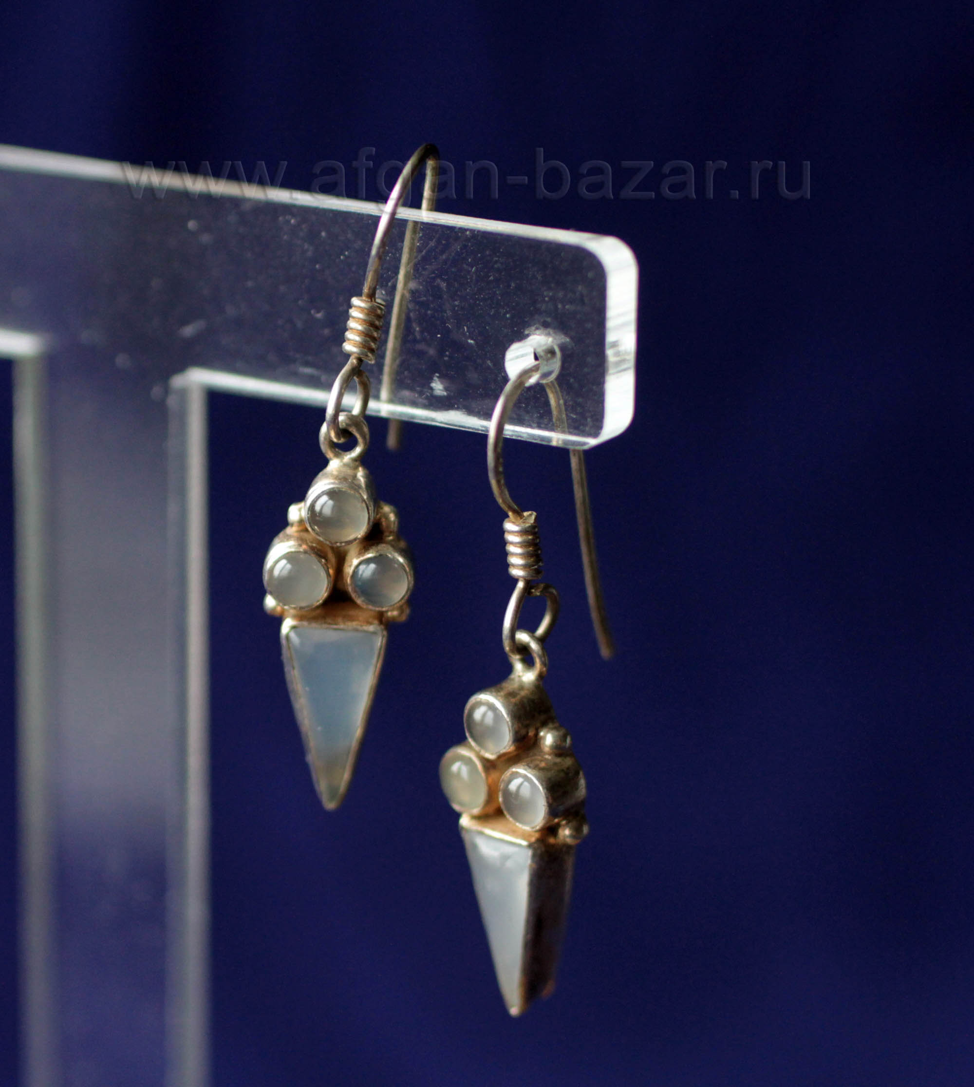 Артикул: 2223Винтажные индийские серьги с халцедоном. Индия, 20-21 вв. Серебро, ручная работа. Вставки - халцедон. Длина - 40 мм. Вес одной сережки - 1,5 г.