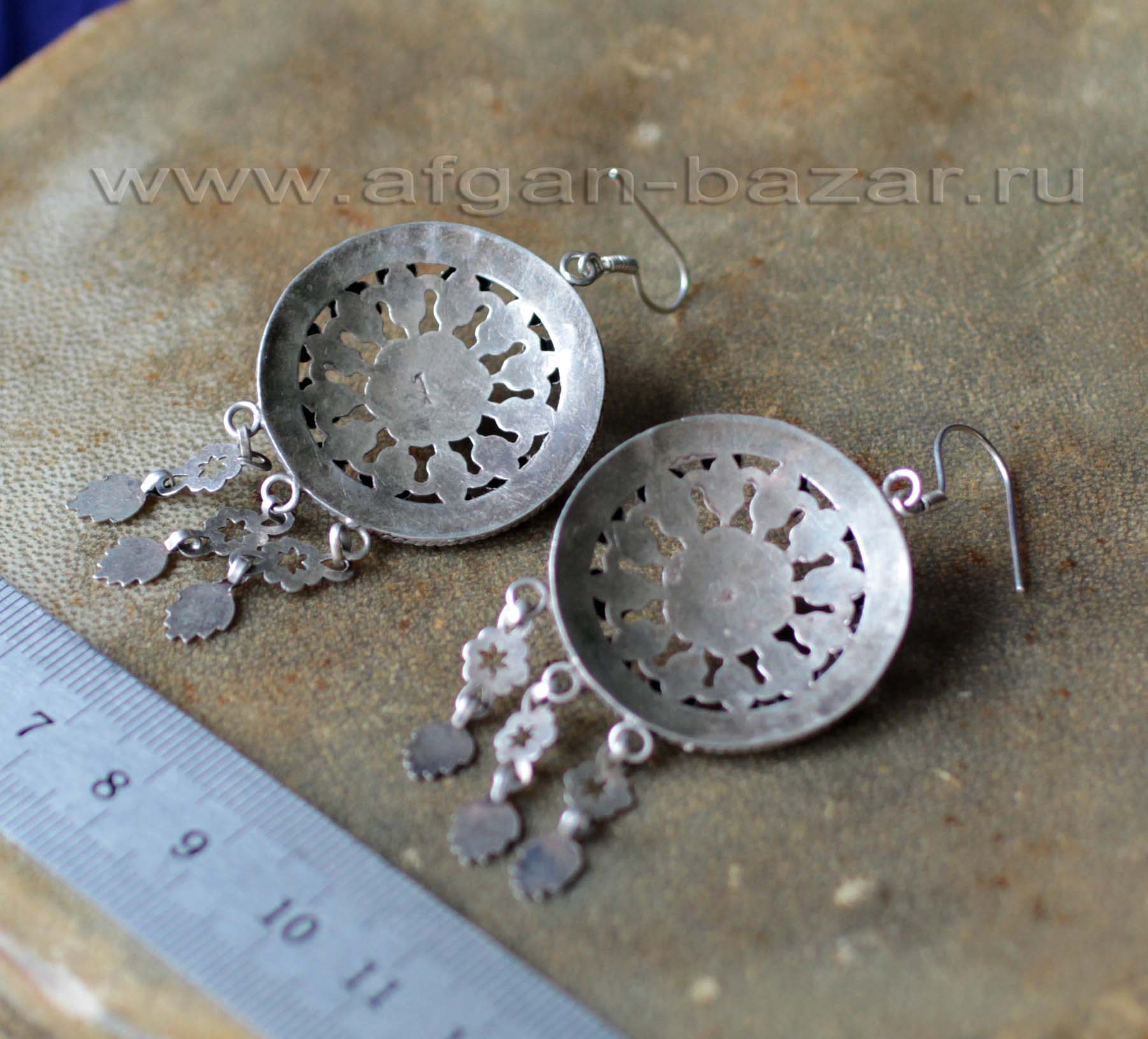 Артикул: 4148Серьги в индийском стиле (украшения Банджара, Раджастан). Производство - Турция, современная работа. Латунь, литье, серебрение. Размер - 46/36 мм. вес одной сережки - 5 г.