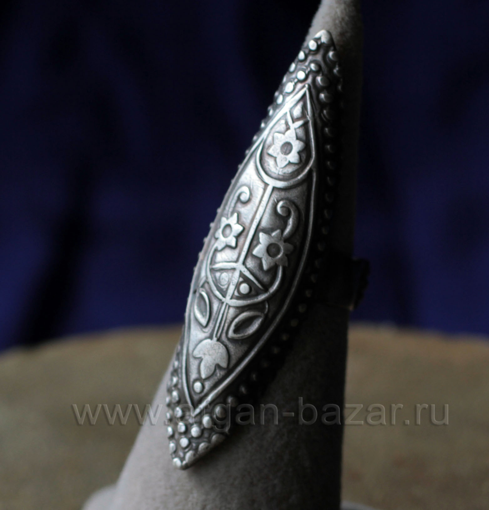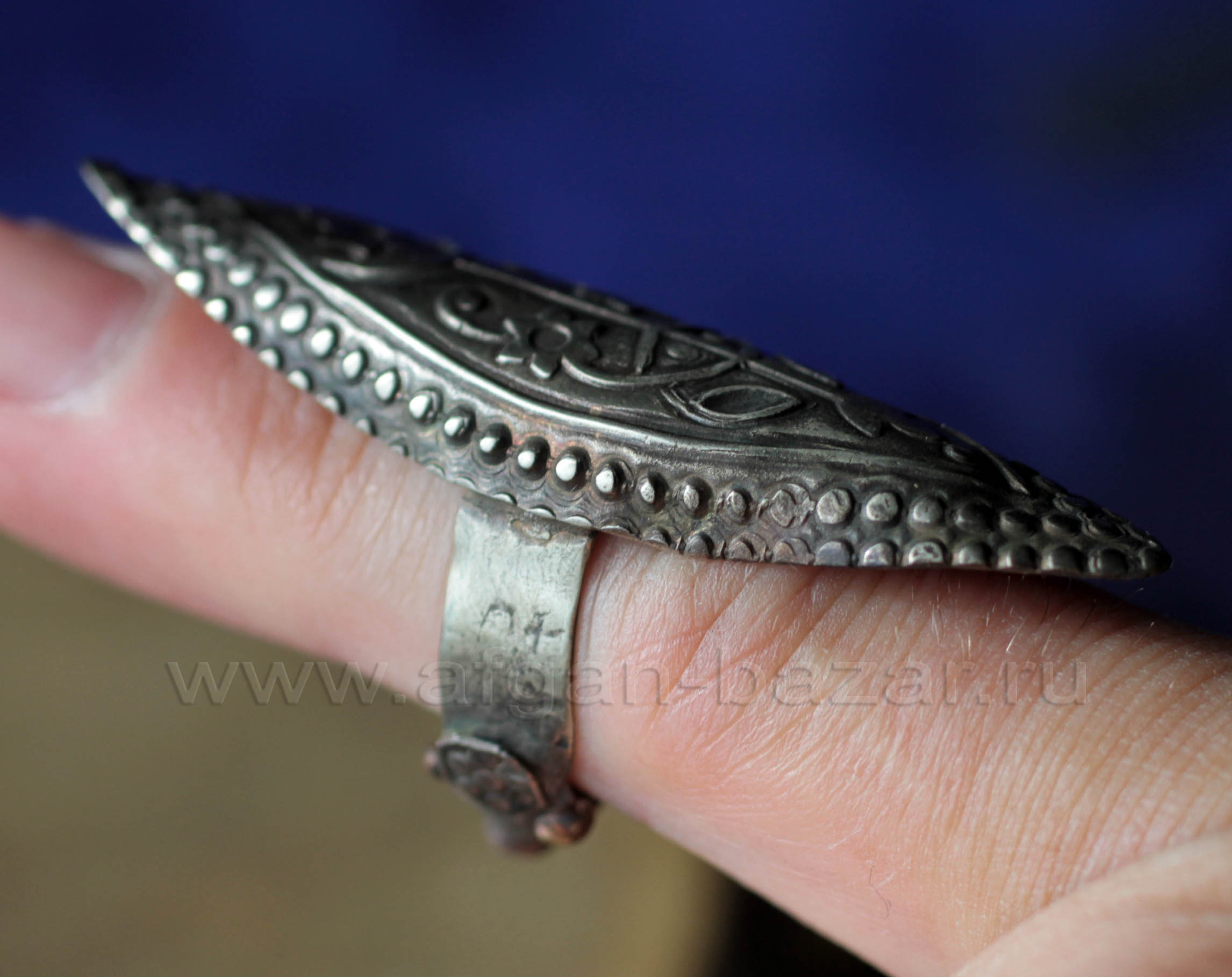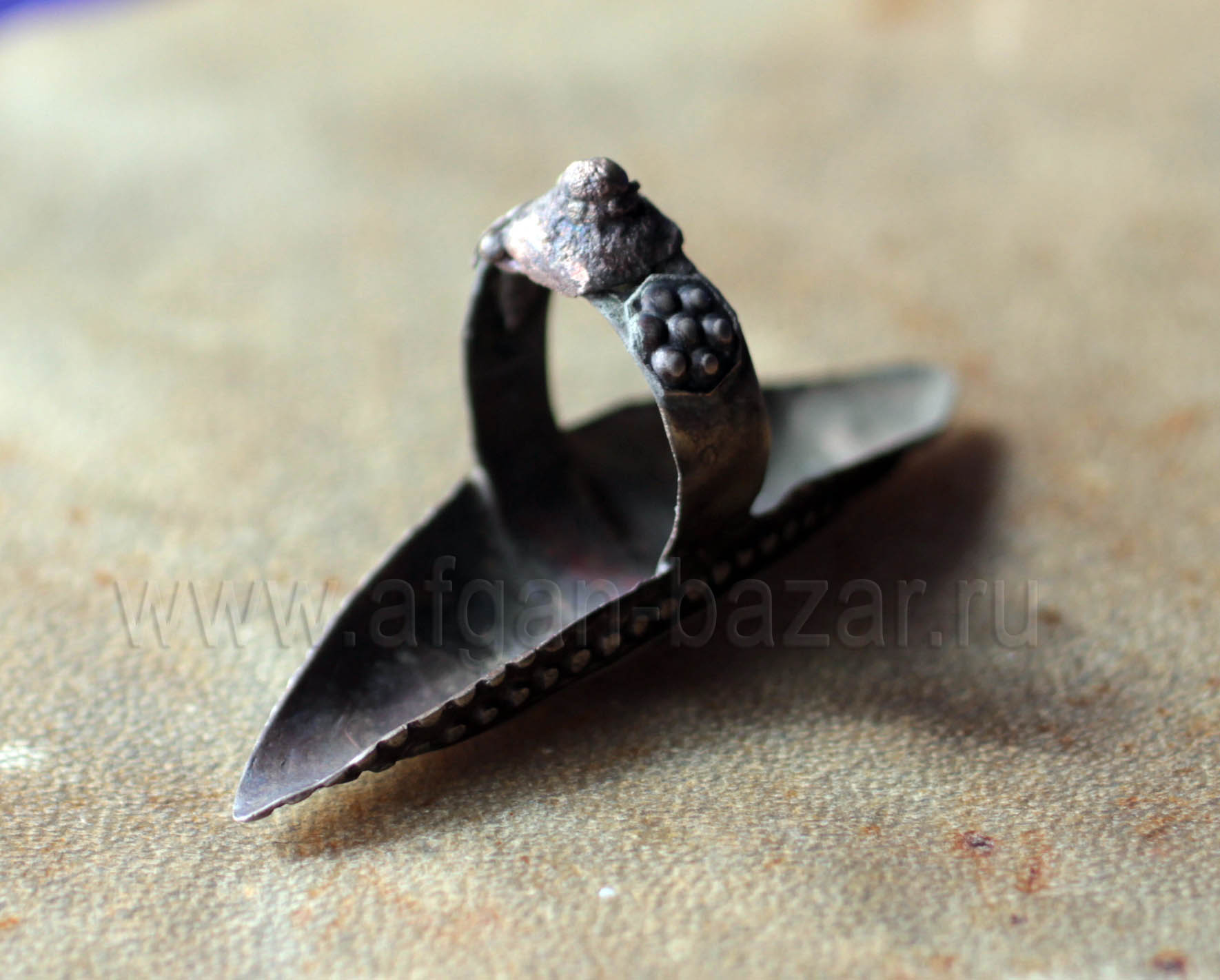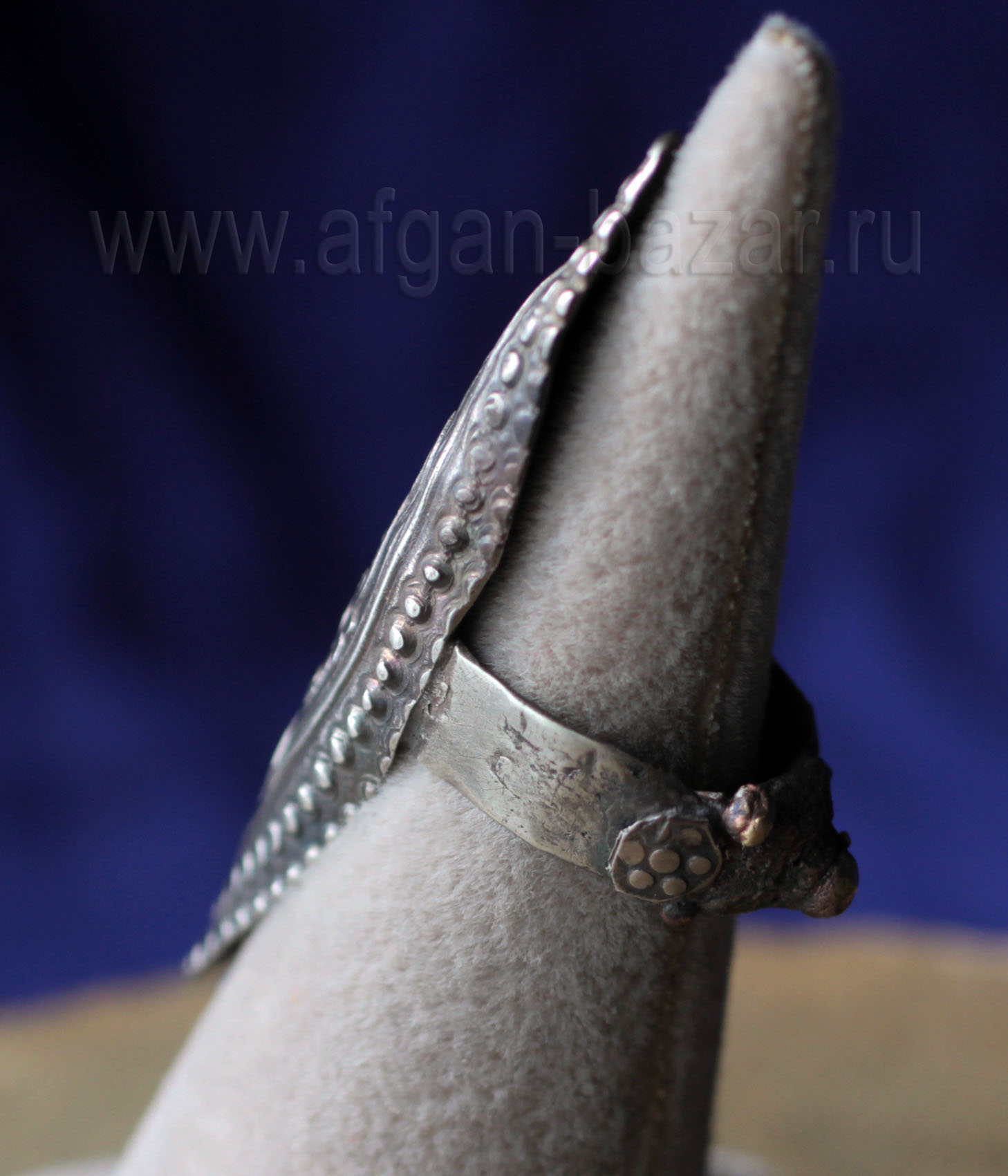 Артикул: 11818Серебряный афганский перстень в казахском стиле. Афганистан, вторая половина-конец 20 в. Серебро, филигрань, зернь. Вставка - стекло на красной подложке. Размер печатки - 21/14 мм. Высота от пальца - 8 мм. Размер - 19,5. Вес - 12 г. Образец "городского" ювелирного искусства афганских мастеров-туркмен. В Афганистане с давних пор изготавливается большое количество украшений, как в традиционном народном стиле казахских этнических украшений, так и стилизованные, но с безупречным соблюдением традиционных технических приемов обработки материалов. В 19 веке такие украшения изготовлялись для прикаспийских казахов. Читать еще про традиции ювелирного искусства Казахов. The example of this and other similar products shows the influence of the Kazakh style on the products of Afghan jewelers. In particular - the triangular embossed overlays imitating grains and forming a laconic toothed ornament in combination with a smooth gilded background-a characteristic technique in the Kazakh jewelry art. Kazakh Style in Afghan jewelry. Since the old Times Afghan Zergers (the silversmiths) was known as the best jewellers in the Middle Asia. Till the beginning of the 20th century they produced jewelry for sale in other regions, especially for the Kazakh tribes in Turkestan. Since that time Kazakh Style has been very popular in the Afghanistan too. And now, the Turkmen jewellers in Northern Afghanistan and Pakistan produces Silver jewelry in the traditions of Kazakh Metalwork.