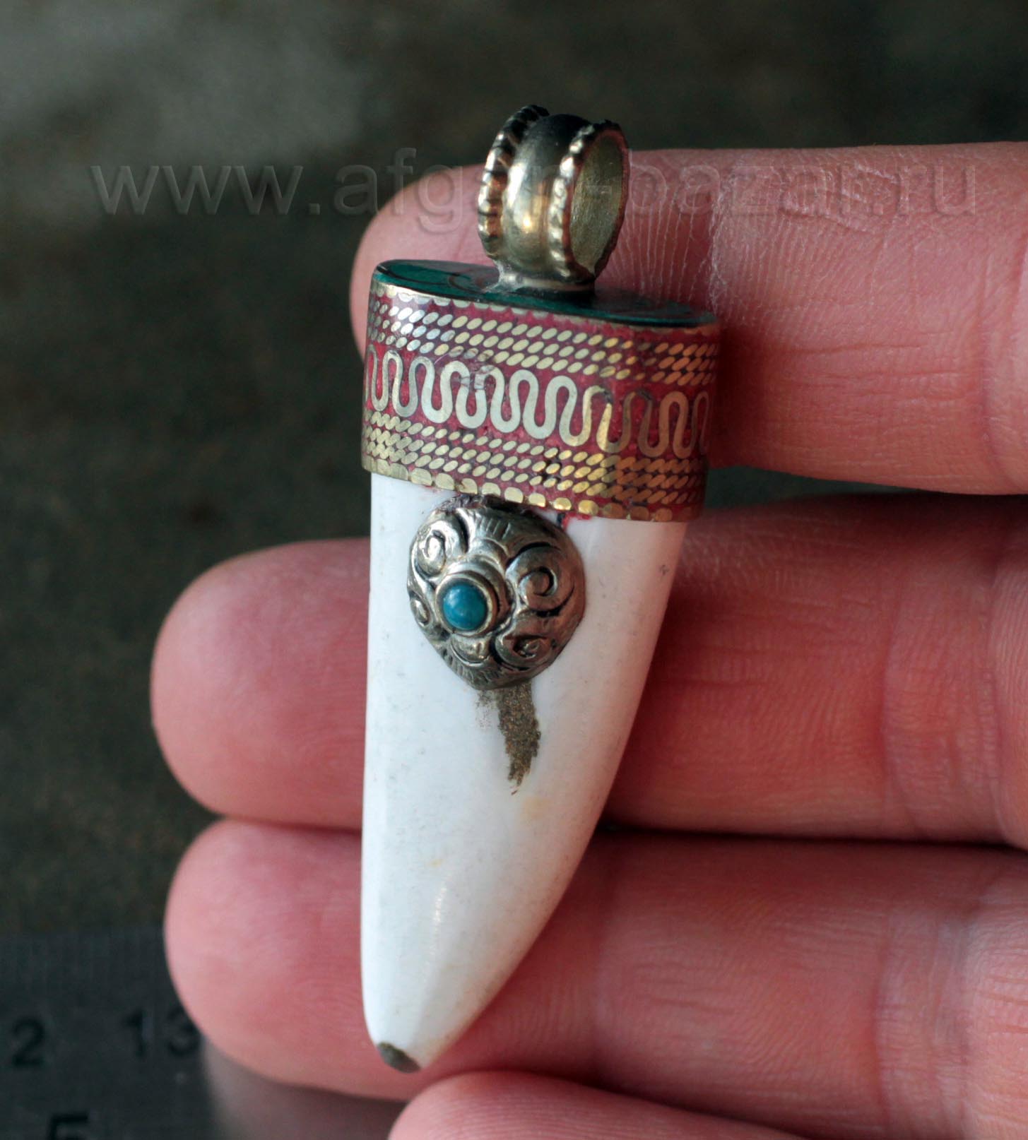 Непальская подвеска в форме амулета Гао из лазурита. Вставки - коралл, бирюза. Бадахшанский лазурит, оправа из чеканной серебряной фольги, ручная работа. Длина - 45 мм. Вес - 13 г. Лазурит - один из трех самых священных камней Древнего Мира (Наряду с бирюзой и сердоликом). В Древнем Египте тот камень был посвящен богине любви Хатор. Более всего ценился темно-синий лазурит чистого цвета. Его привозили из далекого Афганистана, где и по сей день существует крупнейшее в мире месторождение самого лучшего в мире лазурита. В древнем Иране ценились украшения с лазуритом, его отделывали золотом с искусной чеканкой и филигранью. В античный период считалось, что лазурит оказывает на людей магическое воздействие. Его сравнивали с ночным небом и морскими глубинами. В Месопотамии и Вавилоне лазурит высоко ценился, его считали "мужским" камнем в противоположность сердолику, который с древнейшего времени связан с женским началом. С незапамятных времен лазурит идет на изготовление бусин и вставок в украшения на территории современного Афганистана. Самые ценные сорта лазурита - камни, имеющие глубокую синюю окраску, а также сине-белый крапчатый рисунок. Лазурит часто имеет включения золотистого пирита, что оттеняет и дополняет его естественный цвет.