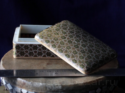 Одна из костяных пластинок, наклеенных изнутри в месте соединения с крышкой отсутствует.
