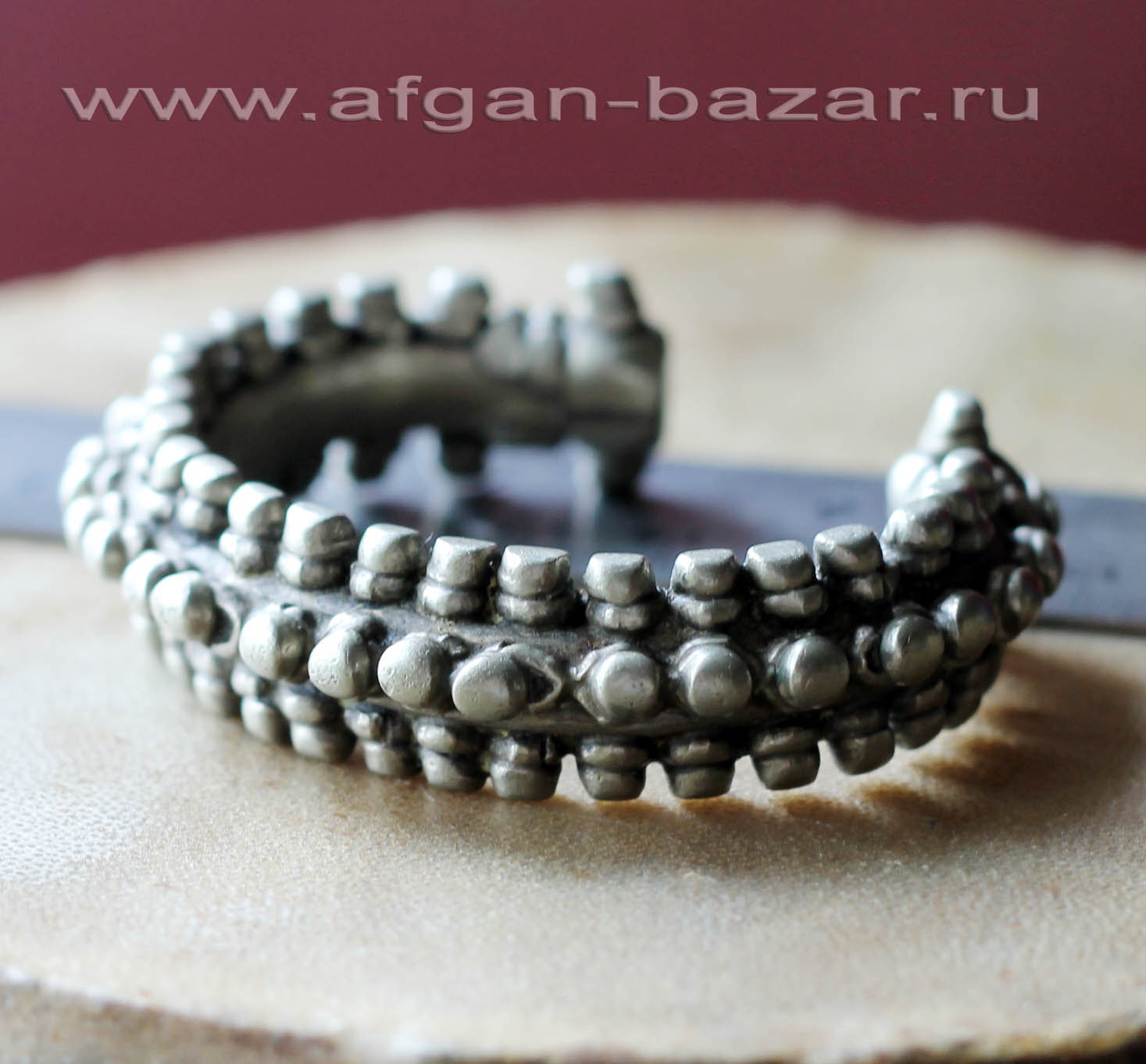 Массивный браслет изготовлен из согнутого металлического прута и украшен крупной зернью, цилиндрической формы (очевидно сегменты зерни нарублены из прокатанного прутка), нпаянной поверх металлических колечек.