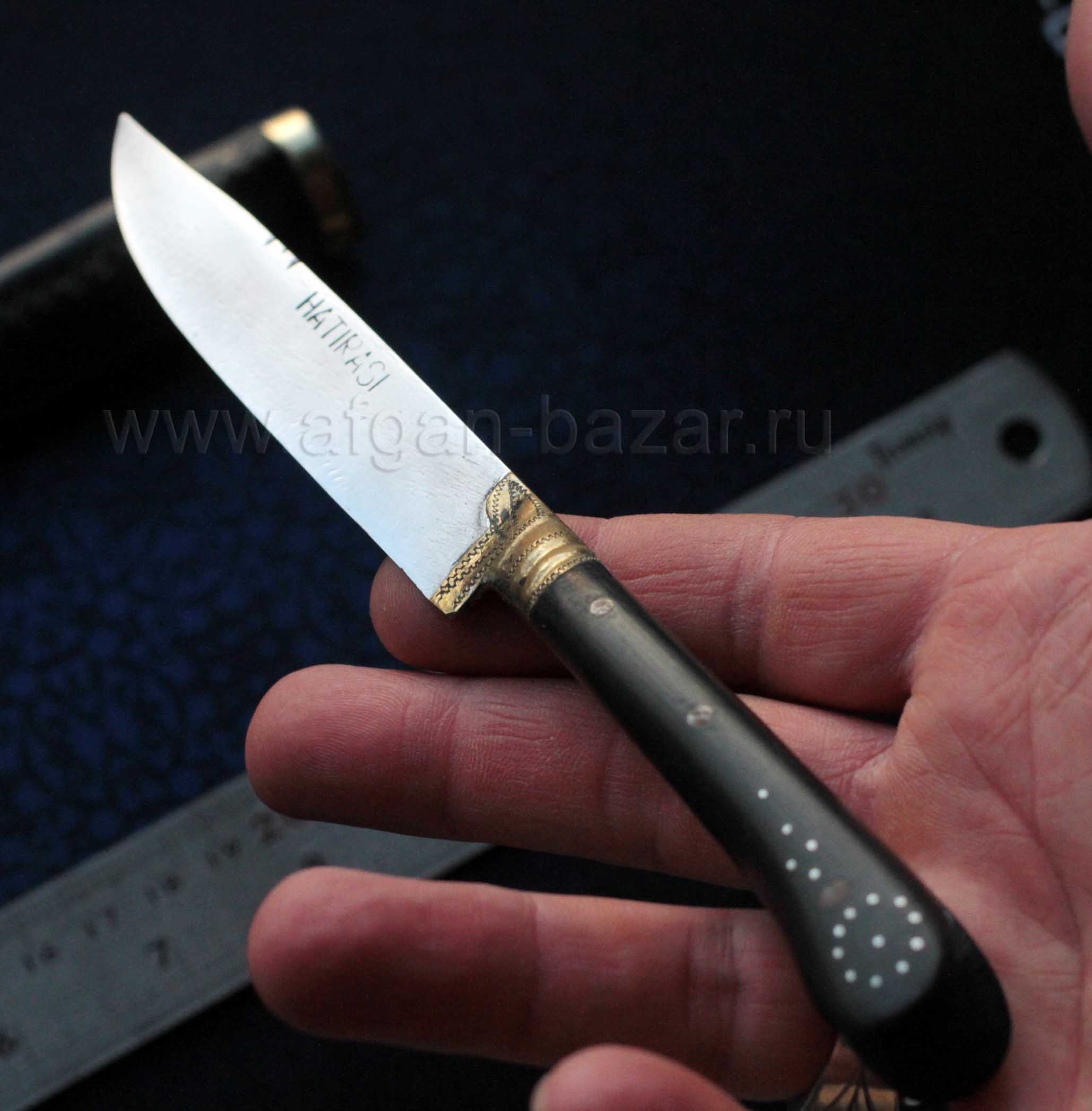 Кованая сталь, латунные накладки с гравировкой, ручка из черного дерева с инкрустацией серебром.