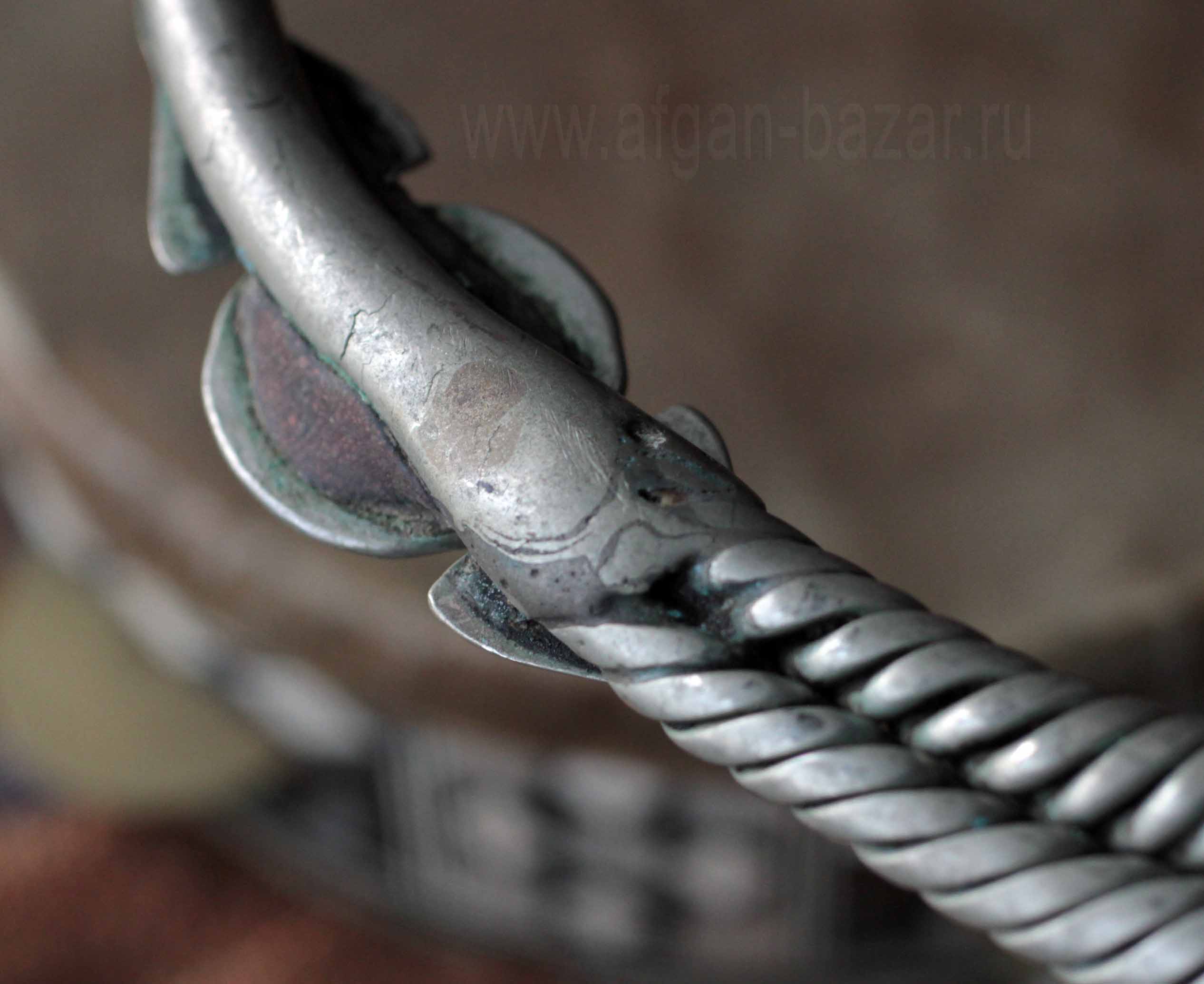 Традиционное украшение языческих племён Кафиристана, гривна Ямни Гер. Производство - Центральный Гиндукуш, территория современного Пакистана, 20-й век. Сохранились оригинальные вставки из голубого стеклосплава, традиционно присутсвовавшие в таких украшениях с 19 века. Чаще в сохранившихся сейчас гривнах вставки заменены на другой материал.