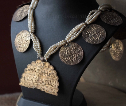 На центральном медальоне выгравирована 112 сура Корана (Аль-Ихлас). Предположительно медальон ранее являлся частью наплечного браслета "Бозубанд".