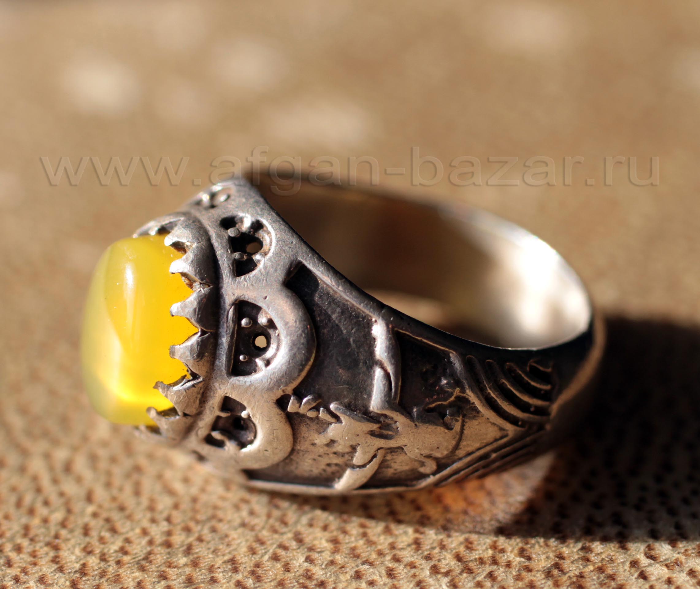 Авторские кольца и перстни, кольца, металл, Украшения, вставки - стекло/керамика, Казахские/киргизские украшения, Наши авторские украшения/горячая эмаль, размер 20-20,5, Авторские ювелирные украшения в этническом стиле, реконструкция античных и средневековых украшений, Украшения в казахском стилеИранский перстень с желтым халцедоном и зороастрийской символикой. Размер - 18,5